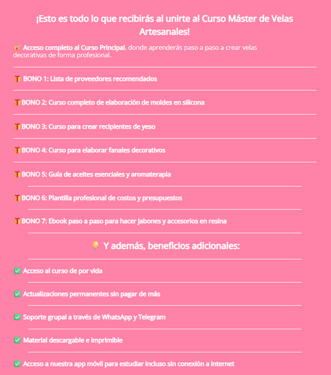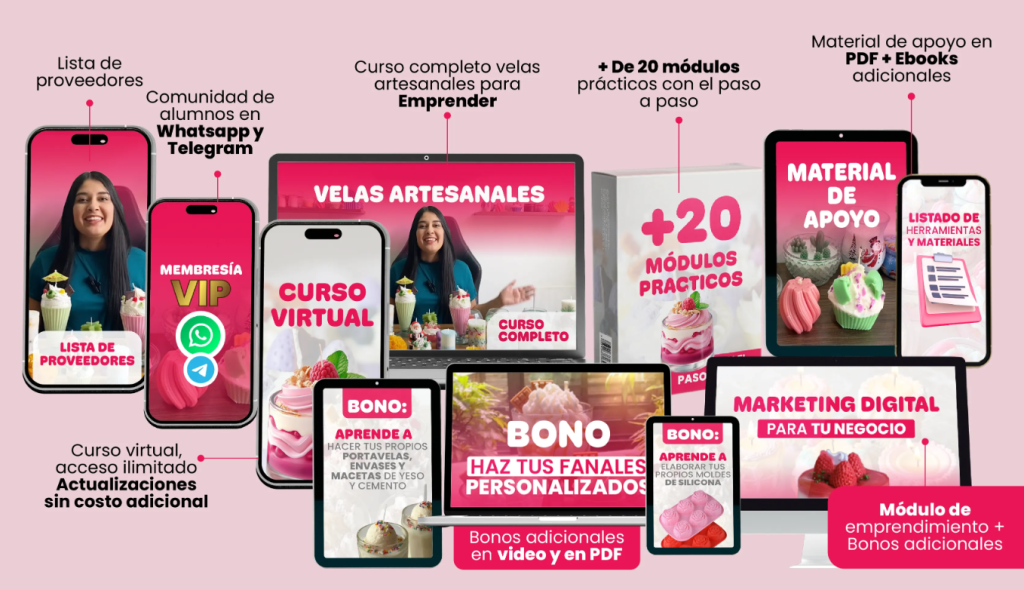 ¡Haz tu compra hoy y recibe acceso inmediato a +430 recetas paso a paso para crear velas únicas desde casa! Además, desbloquea nuestro exclusivo curso en video y empieza a transformar tu pasión en un verdadero arte. ¡No dejes pasar esta oportunidad!